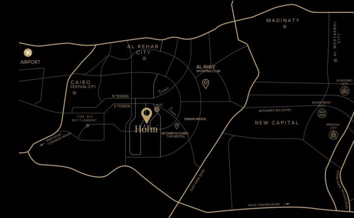 - يمكن الوصول بسهولة إلى الكمبوند Holm Residence new cairo Compound عبر الطريق الدائري الأوسطي، ومحور محمد نجيب، محور جمال عبد الناصر، وطريق السويس.