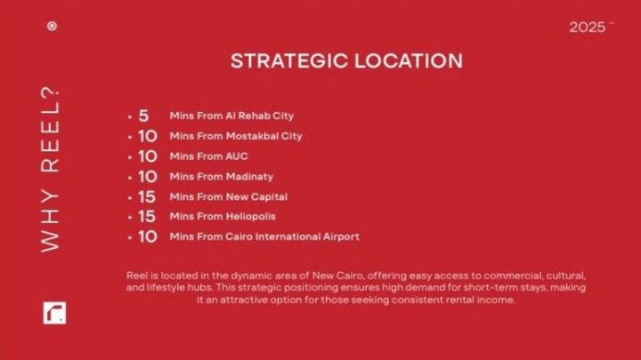 Reel Compound New Cairo is the best phase launched by Al Riyadh Misr for Real Estate Development within the luxurious Biraj Compound. The company has paid great attention to the smallest details, ensuring a strategic location close to essential services and governmental entities. The project features a meticulously planned layout that optimizes space distribution, providing units with world-class designs executed with precision. The company has also considered customers’ financial capabilities by offering long-term, flexible payment plans, making Reel Compound New Cairo a golden opportunity for those seeking luxury and comfort.
